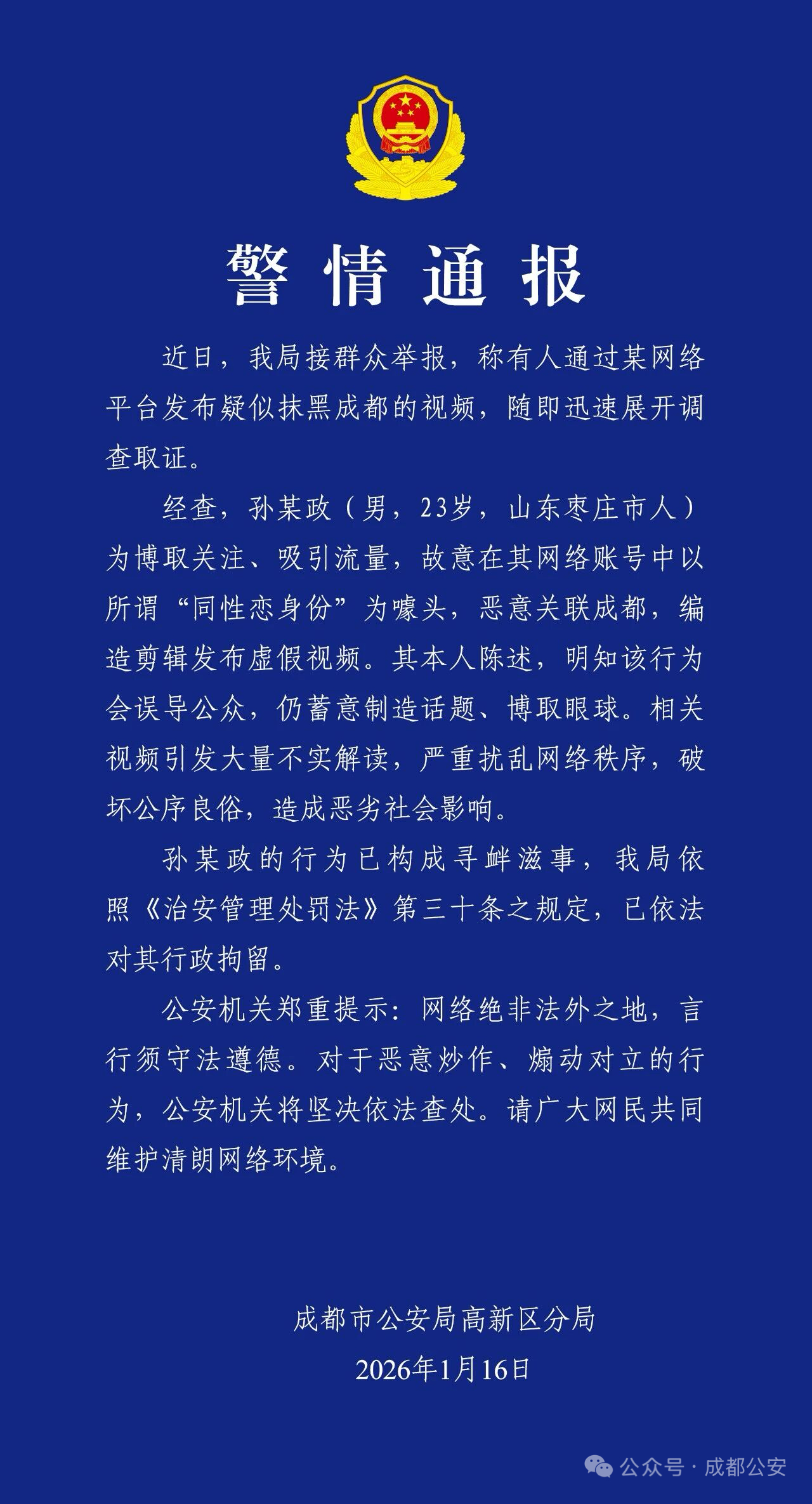 经查,孙某政(男,23岁,山东枣庄市人)为博取关注,吸引流量,故意在其网络账号中以所谓“同性恋身份”为噱头,恶意关联成都,编造剪辑发布虚假视频。其本人陈述,明知该行为会误导公众,仍蓄意制造话题,博取眼球。相关视频引发大量不实解读,严重扰乱网络秩序,破坏公序良俗,造成恶劣社会影响。